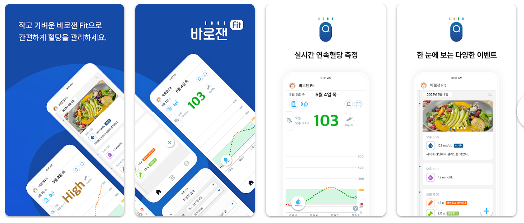 바로잰 Fit은 연속혈당측정 센서와 함께 사용하는 앱으로, 실시간 혈당 데이터 확인 및 관리가 가능한 것이 특징입니다. 다양한 플랫폼 및 의료기기와 연동되는 확장성이 강점입니다.
