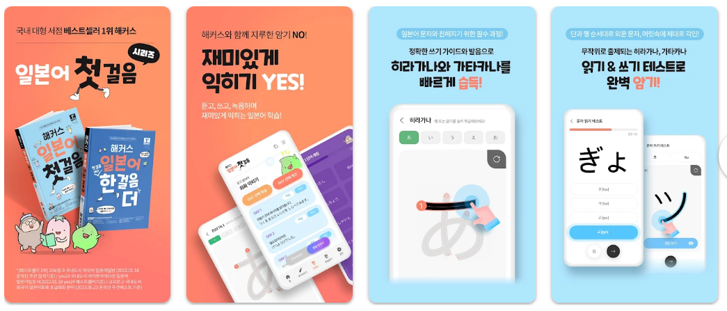 해커스 교재 핵심 내용을 모바일 환경에 최적화한 입문 전용 앱입니다. 초보자가 문자를 익히는 단계에서 포기하지 않도록 시청각 자료와 참여형 콘텐츠를 제공하는 것이 특징입니다.
